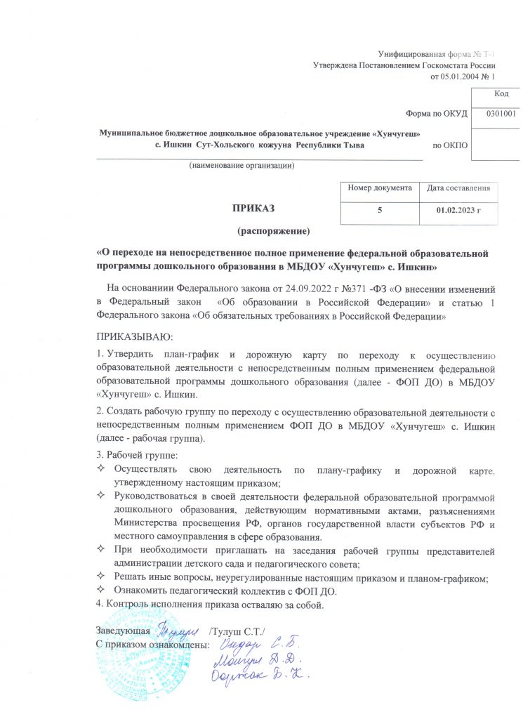 Педагогический коллектив МБДОУ «Хунчугеш» с. Ишкин на педагогическом совете ознакомился с Федеральной образовательной программой дошкольного образования, Дорожной картой ФОП ДО и необходимостью приведения в соответствие с ФОП ДО своей основной образовательной программы, рабочих программ не позднее до 1 сентября 2023 года (п. 4 ст. 3 Федерального закона от 24.09.2022 № 371-ФЗ) .
